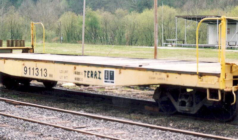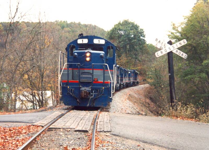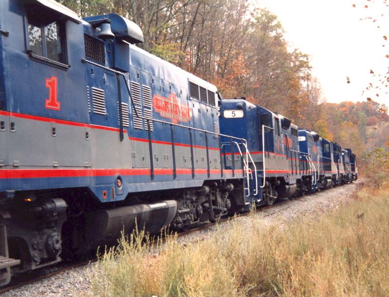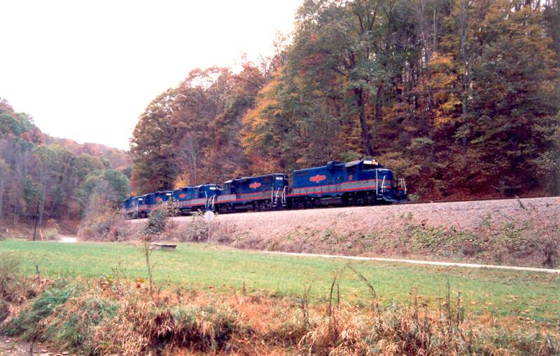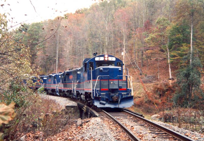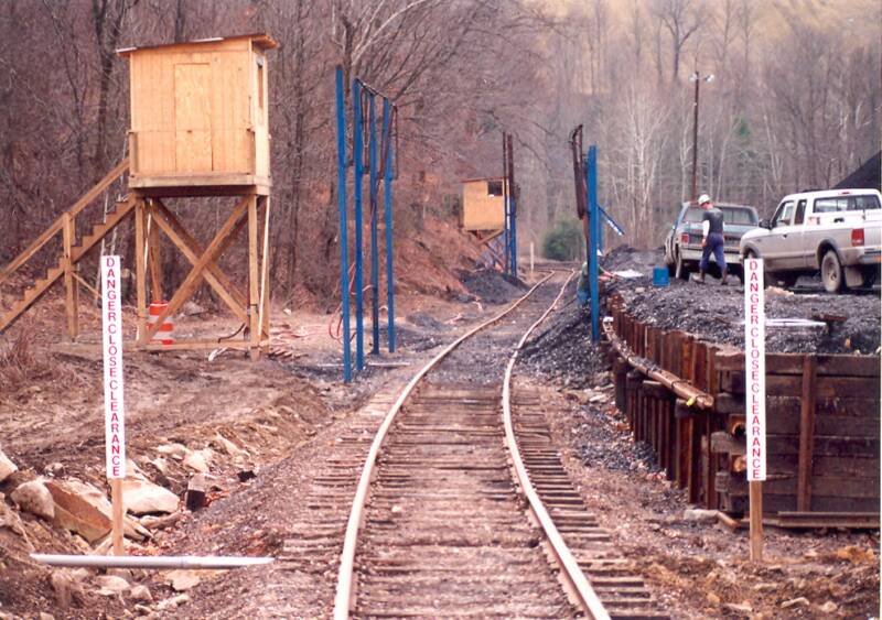 The first trains actually ran from Avoca in 1996. A set of about 90 AEP coal cars were used and interchanged with the CSX at Gilmer. One train per week was loaded at Avoca using a couple of Caterpillar 992-C front loaders. Typically 3 of the 5 TERRI locomotives were used on the train into and out of Avoca.