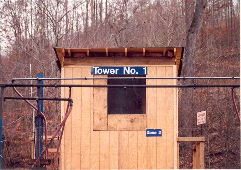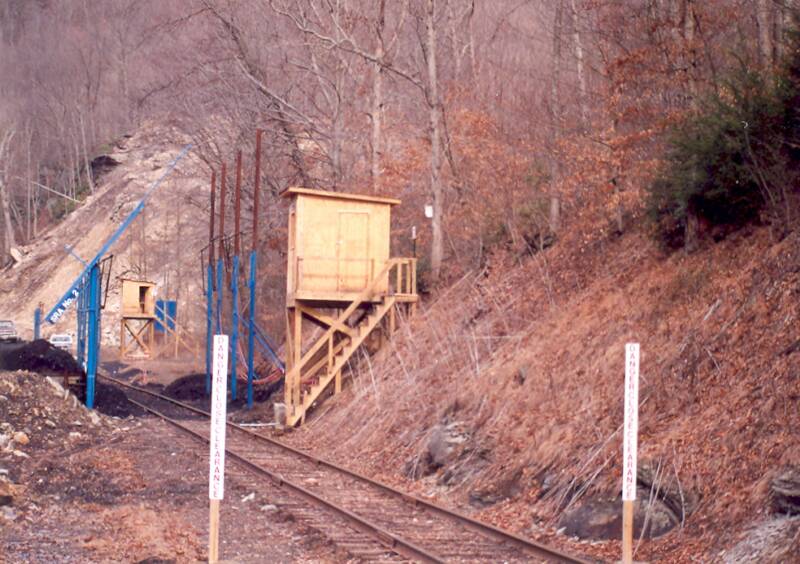 This is how the Avoca loading facility looked when new. Front loaders and an old D-8 dozer approached the train from the side via the raised berm on the right of the photo below right. The plywood shanties were used for observing the operations. According to Ned Harris, VP of Engineering for TERRI, the purpose of the blue columns was to spray anti-freeze on the coal while it was being loaded to prevent it from freezing together in the cars.