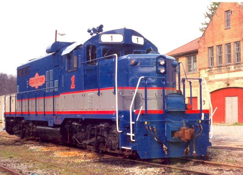 The TERRI acquired five "elderly" 4-axle numbered 1 through 5. These were selected due to the tight 19 and 20 degree curves along the line. Engines #1, #2 and #3 were rebuilt GP10's. Engines #4 and #5 were GP9's. The engines were built between 1952 and 1959 and served on lines as varied as the IC, Wabash and N&W. All the engines received a very nice blue, red and silver paint job and looked all the world like a serious shortline! All the photos below were obtained from the Elk River Railroad.