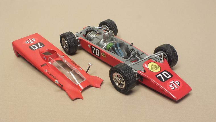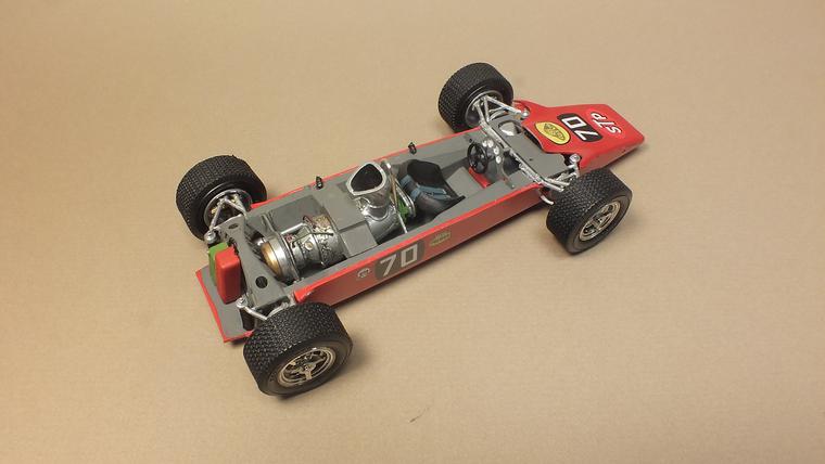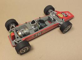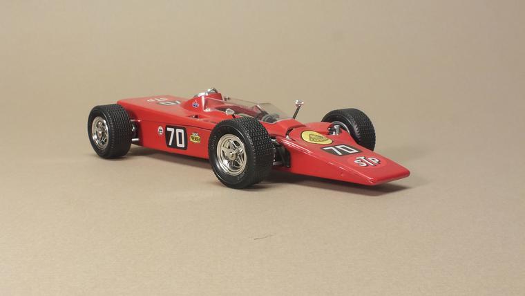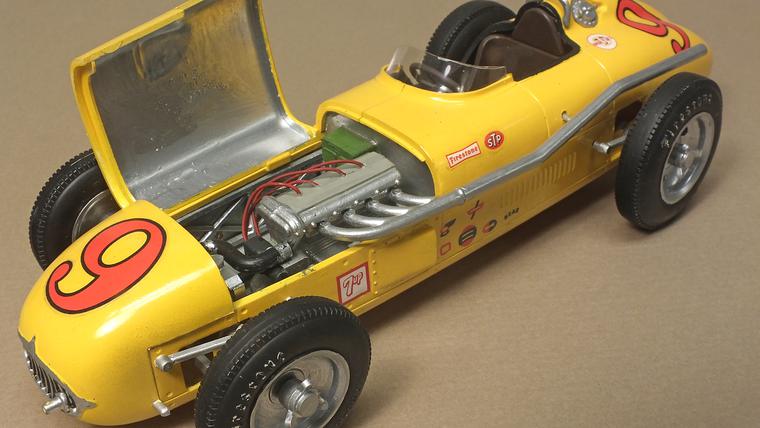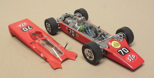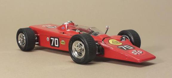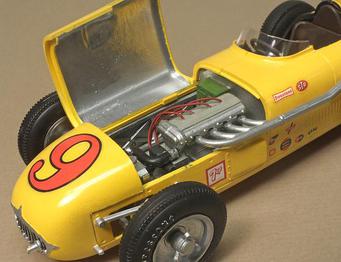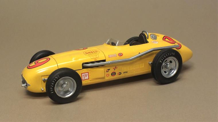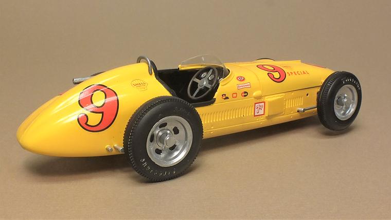 This Kurtis Kraft roadster was built from an older Monogram kit. The engine was wired and the suggestion of the tubular structure was added to the engine bay. Otherwise the kit is unmodified.