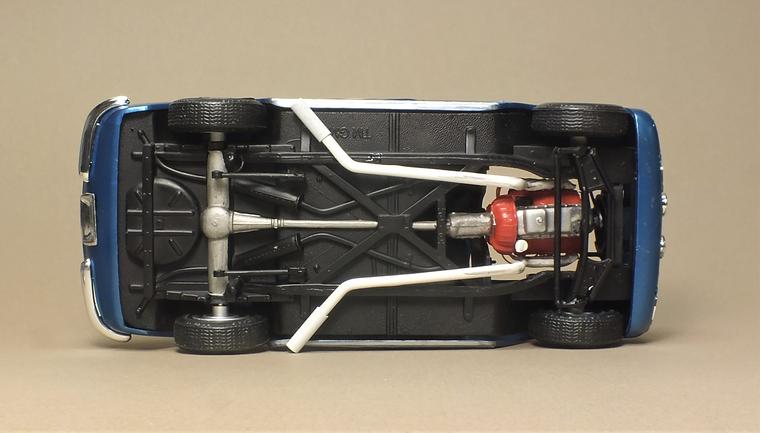 In international races, Corvettes wore US colors of white with blue stripes. Many used the stock fuel injection system. In local races, cars were run in any number of paint schemes. The red car above was among the ones that influenced my model. Parts from three different kits (an MPC '60 Corvette and two AMT 1962 Corvette kits) and my parts bin were combined to produce the model. The back window and the fuel filler enclosure were scratchbuilt from sheet styrene. The model represents a replica of a vintage endurance race car as it might be built and raced today. The small block engine is fitted with dual quad carbs.