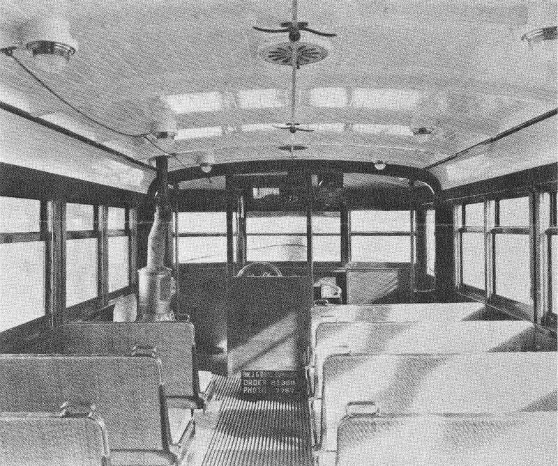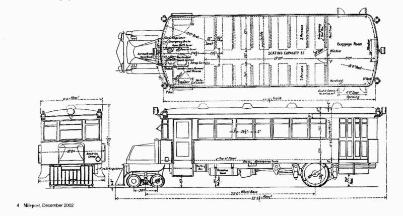 This wonderfully detailed drawing of Motor "A" comes from the December 2002 MILEPOST, a publication of the Friends of the Railroad Museum of Pennsylvania. It can be seen in detail by clicking on it to enlarge. The overall length of the bus was about 32 feet and the distance from the center of the front truck to the rear axle was 22 feet. It had a seating capacity of 35 with a 6 foot long baggage room at the back. Note that this drawing, and the builders photo above show the bus fitted with marker lights front and rear. This drawing does not, however, show the stove.