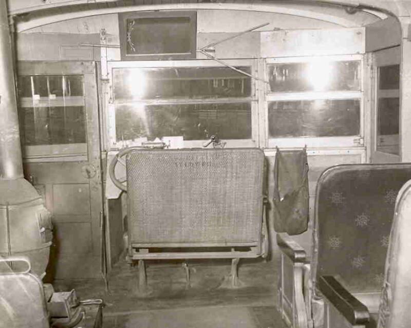 In this builders Interior photo the pot bellied stove can be seen in the left front corner. The driver sat in center. The circular device that looks like a steering wheel was actually a brake wheel. (See drawing and additional photo below)