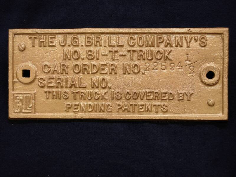 Richard Manning, General Superintendent, apparently gave John Killoran permission to remove the Brill builder's plate from Motor "A" when the railroad closed. Frank Criswell was fortunate enough to be able to recently purchase the plate pictured here. This is the original color of the plate as Frank cleaned off the many layers of paint that had accumulated. Ir measures 7 3/4" by 3 3/4" and is about 3/16" thick at the edges.
