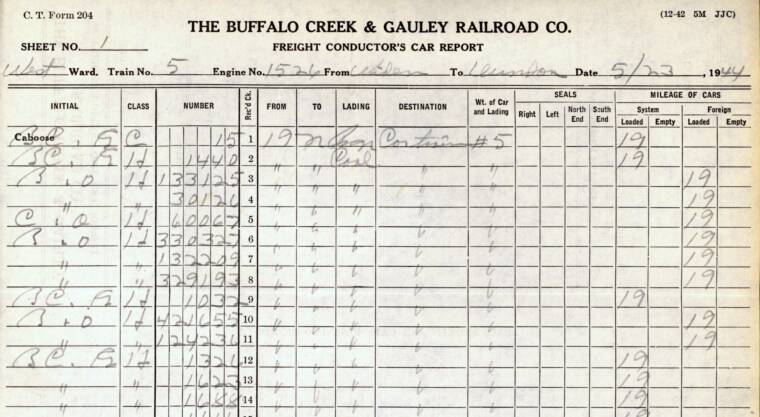 Below is a BC&G Freight Conductor's Car Report from May 23, 1944 from the authors collection. It contains a couple of surprising pieces of information. Most notably, the locomotive number is clearly stated on the top line as #1526. Ed Kirstatter reports that the B&O records as reported in WIlliam Edson's book STEAM LOCOMOTIVES OF THE B&O - An All-Time Roster (1992) are clear. B&O #1527 and #1529 were sold to the BC&G in 1925 and 1946 respectively. Further, the records show that their #1526 (c/n #16144, blt 8/98 and therefore a sister engine to #1527 and #1529) was retired (does not say scrapped) in 1944. One explanation of this 1944 BC&G Car Report document is that the BC&G had leased #1526 from the B&O and it was in service on this day in May, but the BC&G may have never bought the engine. How long it might have been in service on the BC&G is a matter of speculation, but in 1946 they purchased B&O #1529. It would seem logical that the lease of #1526 would not have extended past the purchase of #1529.