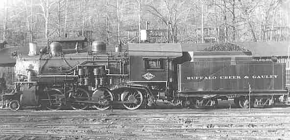 This photo shows the fireman's side including the dual air pumps. This undated photo was no doubt taken later than the one above because she's wearing the diamond BC&G logo. The picture was taken from an unusual vantage point, possibly the berm carrying the main that ran along the shops. The long machine shop is behind the boiler. The houses across Buffalo Creek are visible through the bare trees.