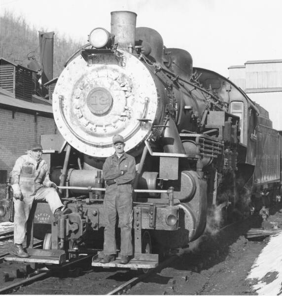 Here's #13 at Widen. That's fireman Job Young on the left and engineer Ab Wilson on the right.
