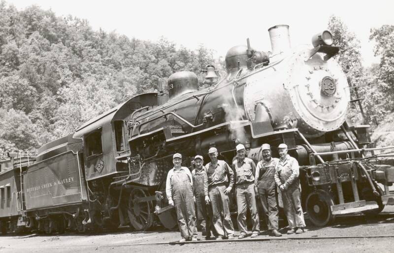 While as modelers we enjoy the hardware, it was, of course, the people who made the railroad run. Above: Left to right is Willard Morris, Riley Sears, Ralph Acree, Bobby Caruthers, and Carl Sear.