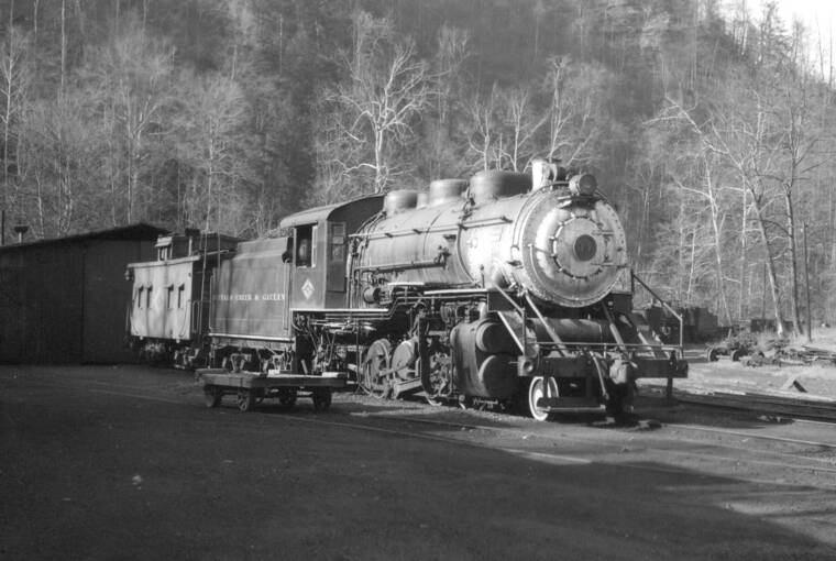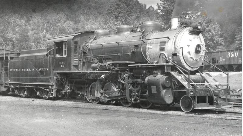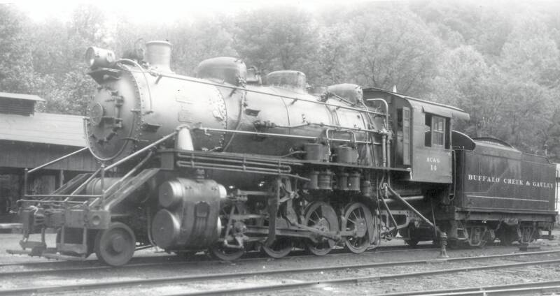 BC&G Consolidation #14 was acquired from the Kelly's Creek & Northwestern in 1950. It is an interesting engine in that it started life as an 0-8-0 switcher having been built by Alco-Schenectady in 1918 as c/n 59309 where she served as a mill switcher. ALCO did the conversion to a 2-8-0 just before the engine was sold to the KR&NW, date unknown.