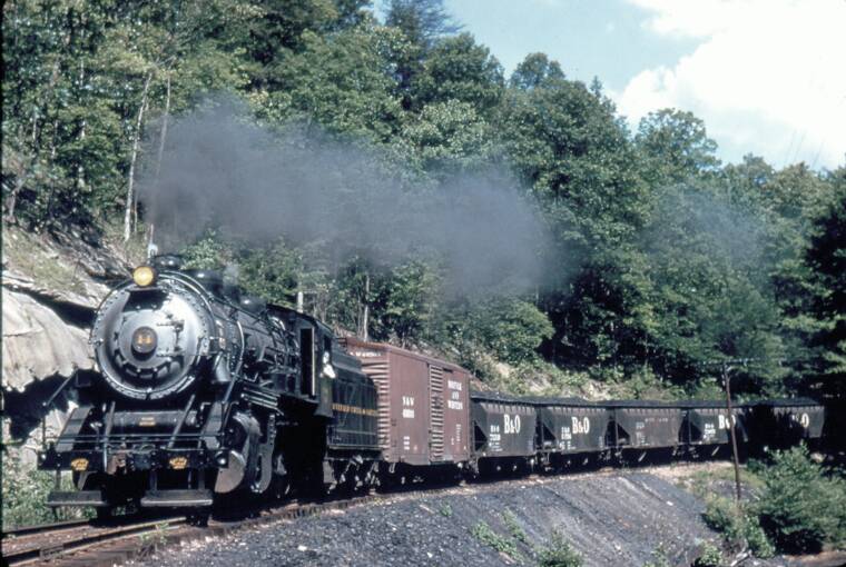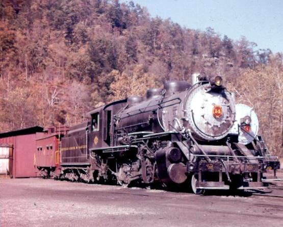 This is one of my favorite photos of #14 out doing what she did best...hauling loads of mostly B&O hoppers from the mine. This undated photo is from a collection of slides sold by Al Chione. Photographer and date unknown.