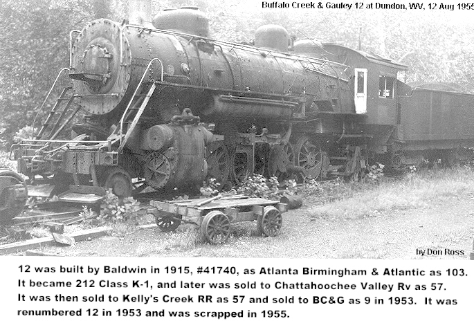 .According to the caption on this photo, the engine is ex-KC&NW #57...and BC&G #12. The caption states that in 1953 it was BC&G #9, and in fact, the 1950 Financial Report lists a #9 purchased that year along with #13 and #14. The construction number matches the number given by other sources as BC&G #9.