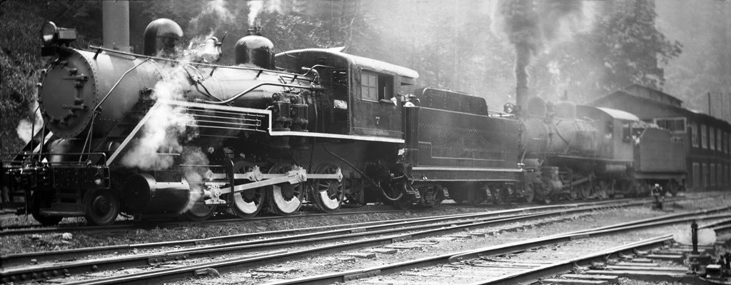 This photo by James Greene taken in July 1948 shows #7 and #6 in service at Widen. It appears they are coupled together forming a double-header. Of particular note is the rather unusual (and unsightly) paint scheme on #7. Fortunately, The Green photo shows the other side of the locomotives.