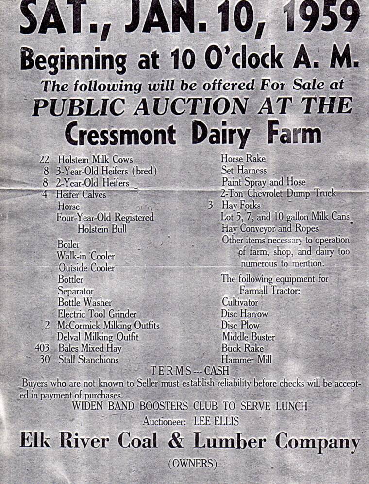 Here is a VERY unusual document...an announcement of the public auction of the cows and equipment from the Cressmont Dairy, obviously after the sale of the properties in 1958. Click on the image to see an enlarged, and easy-to-read version. Notice that lunch was served by the Widen Band Boosters!
