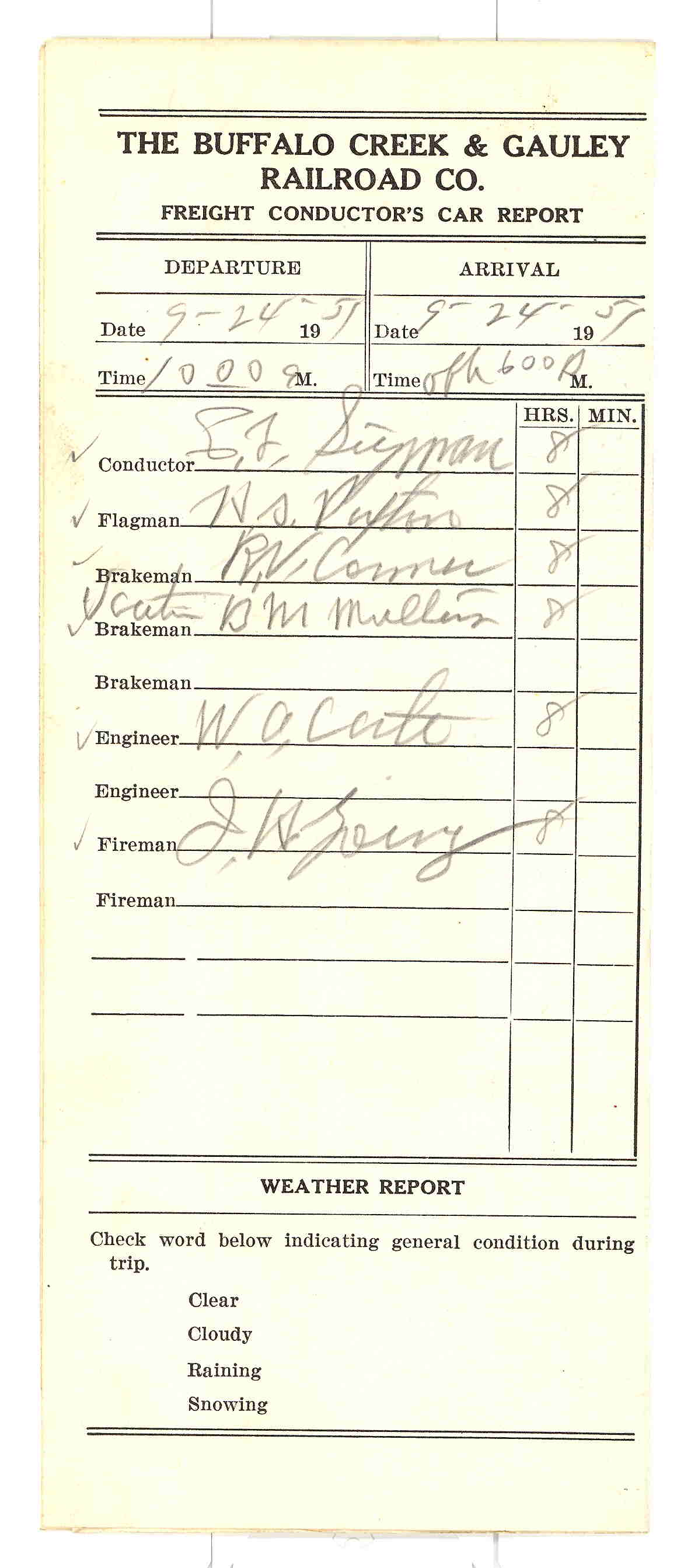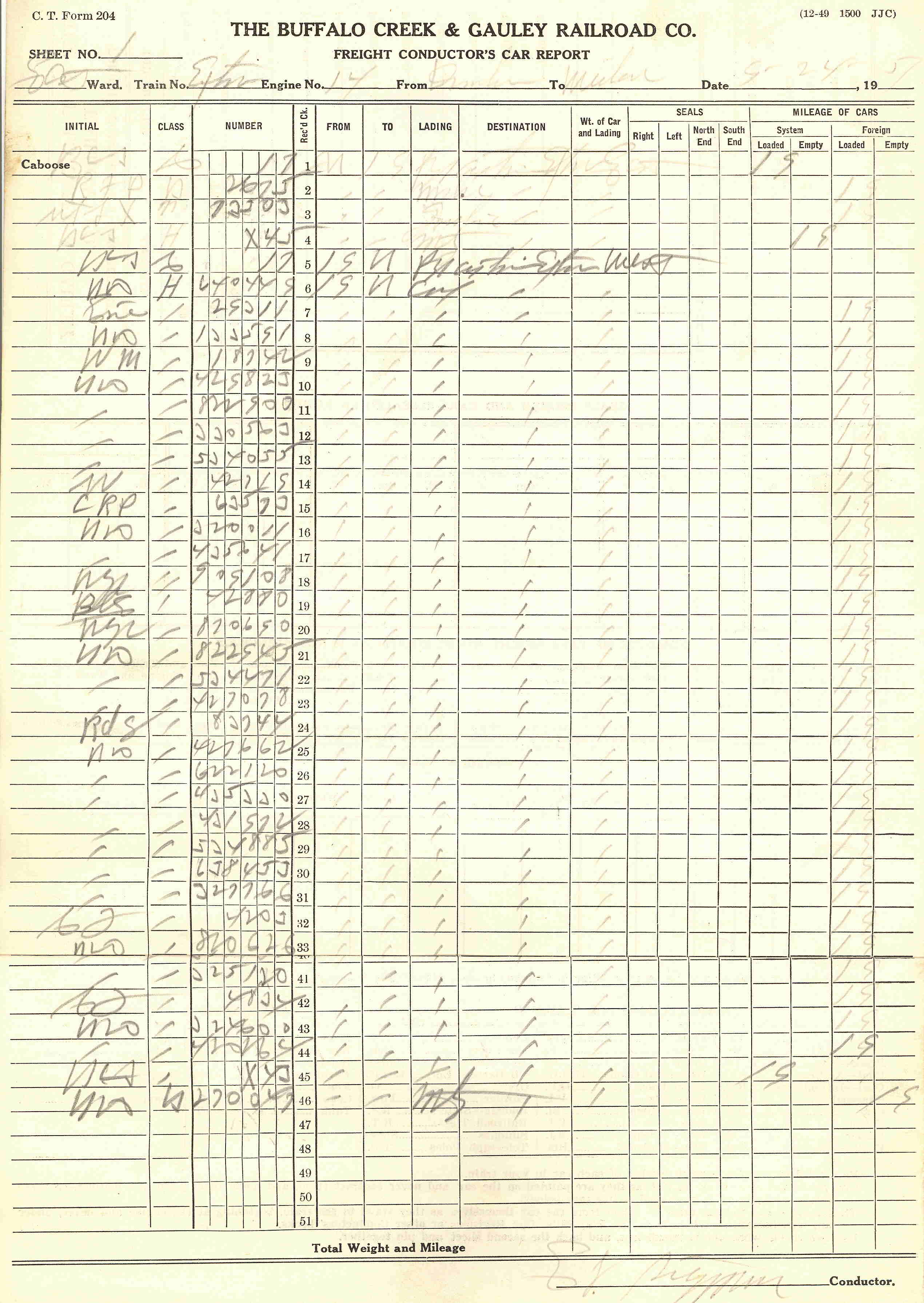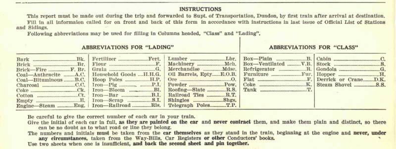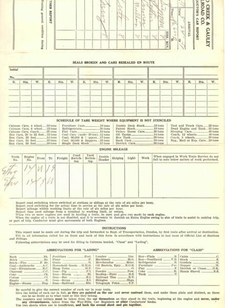 This form documented the cars in each train. On the front was information about schedule, crew, work hours and even weather. On the back the conductor, in pencil, listed all the cars in the train, road name and number, and miles moved. Of particular interest to the modeler, all the abbreviations for "lading" and car "classes" were listed on this form. That portion of the form has been enlarged below. Notice that the BC&G did not use the standard AAR car class abbreviations. This information can be used to add realism to any paperwork created for model operations.