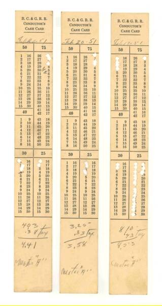 These long cards were punched by the conductor on Mack MOTOR 'A' to record the cash collected. At the end of the day, the total collected was noted on the bottom..