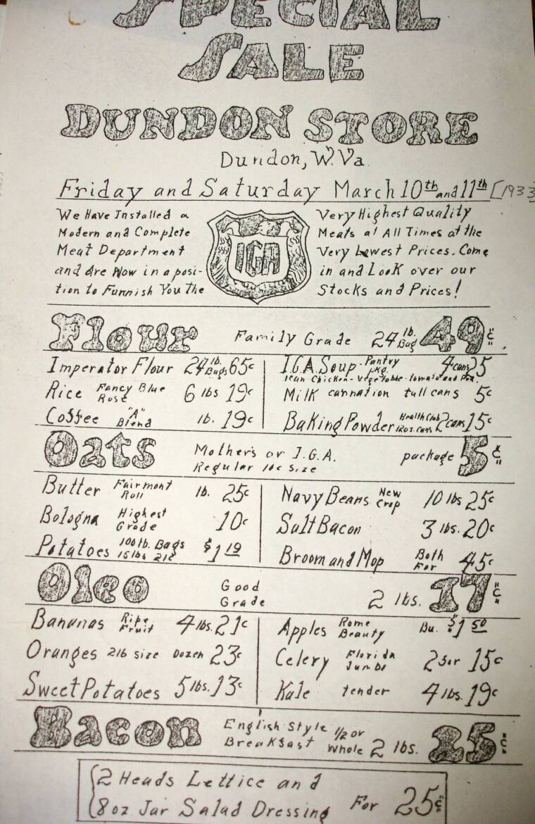To the right is an advetisement for a 'Special Sale' at the Dundon Company Store on March 10 and 11, 1933. Fortunately, someone put the year in parenthesis so that important information would not be lost. I particularly like the snappy hand-dawn IGA logo. THis fascinating document is from the collection of Naomi Ashley.