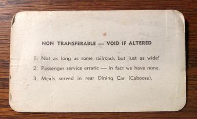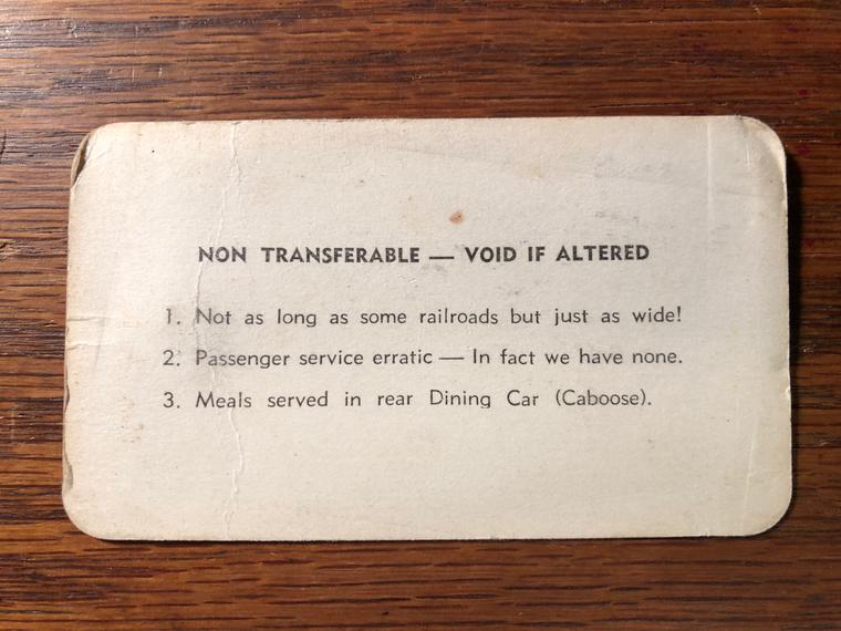 "Note the President’s signature on the courtesy pass; he was my father, He told me that as president of the coal company and therefore president of the railroad. He was invited to national railroad conventions where it was common for the railroad executives to exchange courtesy passes, so he had some passes printed, mainly as a joke as is evidence by the terms on the rear."
