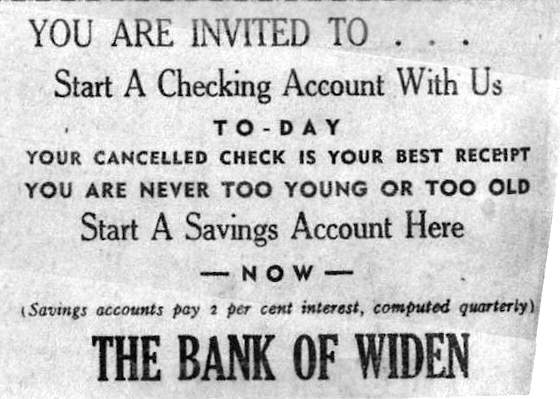 Naomi Ashley has provided these three ads from the September 28, 1957 edition of the WIDEN NEWS...another vignette into the life of the folks in WIden just a little over a year before the Rich Run Mine closed.
