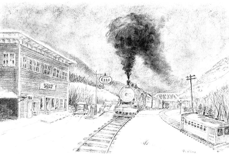Patsy Baughman, a regular contributor to this site and former Dundon resident has shared this sketch of BC&G #13 passing in front of the Dundon store that was done by her son-in-law Rev. Danny Kline. Rev. Kline is retired and living in Pennsylvania. This sketch was made into note cards. What a terrific sketch and wonderful tribute to the memory of the BC&G.