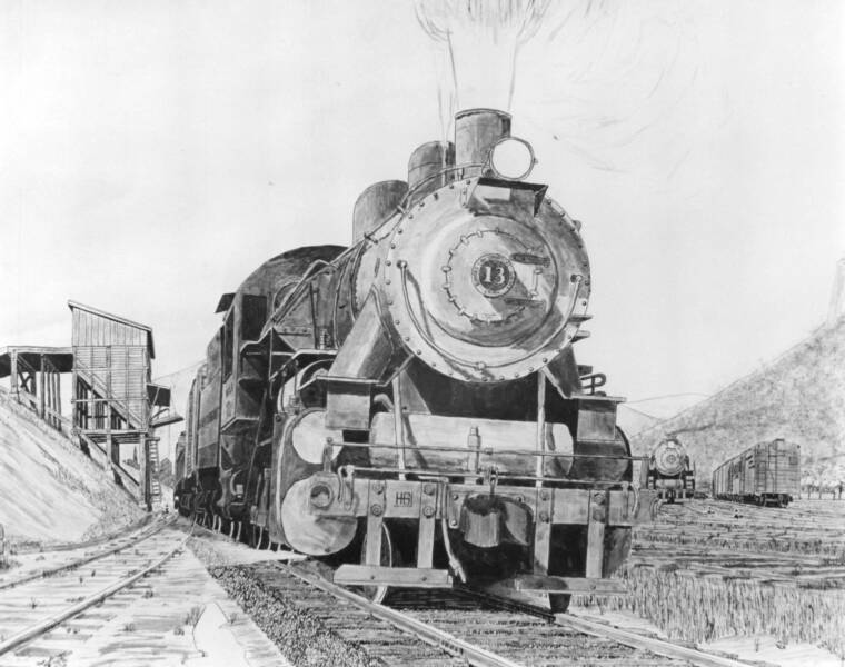 This drawing was done by Harvey W. George who grew up in Greensboro, NC and now lives in Georgia. He did the pen and ink drawing in 1962. Although Harvey never actually visited the BC&G, he did the drawing because the line was one of the few still in steam at the time. The details on #13 and #14 (in the background) are accurate but the rest of the scene was freelanced by the artist. J.Parker Lamb took the photo of the drawing.
