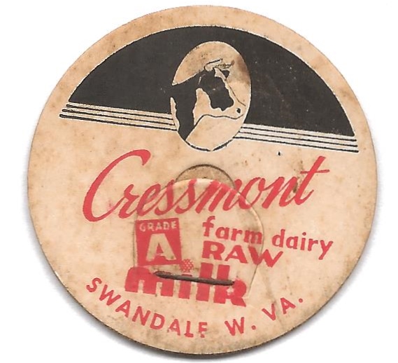 CRESSMONT DAIRY BOTTLE CAP - Judy Hart provided this image of a very rare artifact, a unused bottle cap from one of the glass bottles used by the Cressmont dairy. Of note is that it says "Raw Milk" indicating that the dairy only bottled the milk and did not process it in any way.