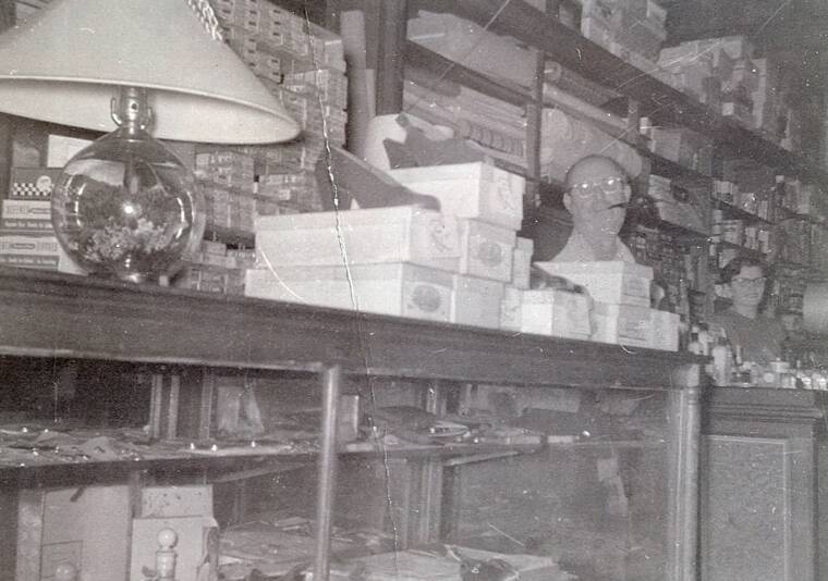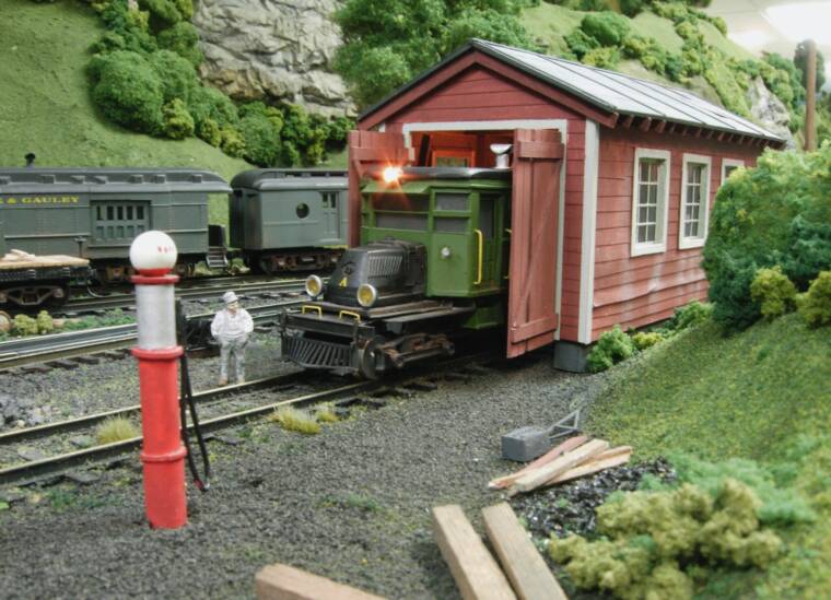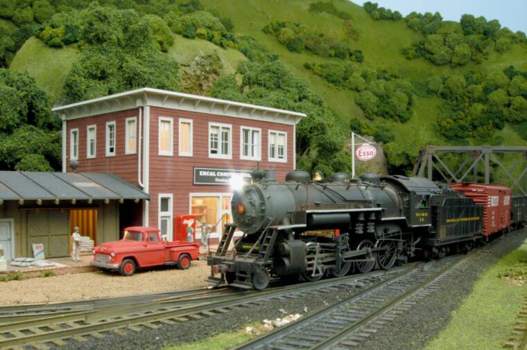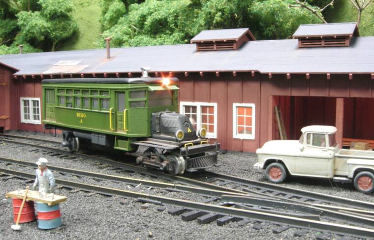 This photo of BC&G #14 returning from the interchange was inspired by the prototype photo of a similar scene with #13. Note the ESSO sign and the interior detail in the store.