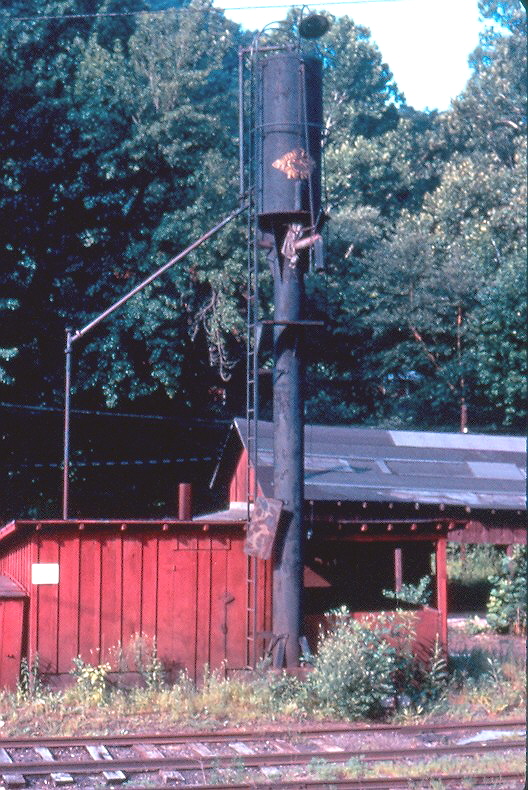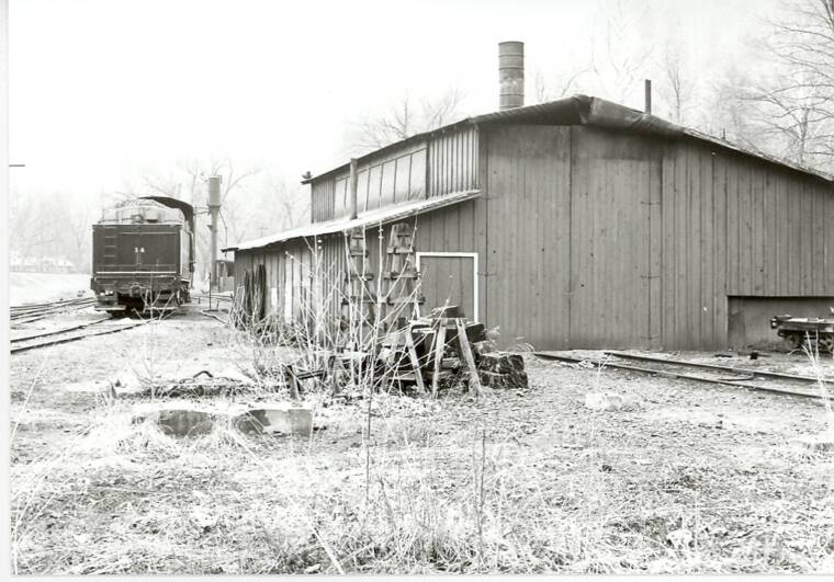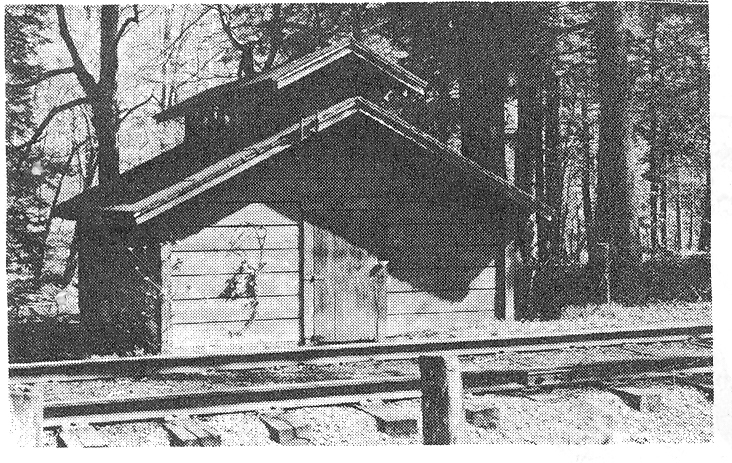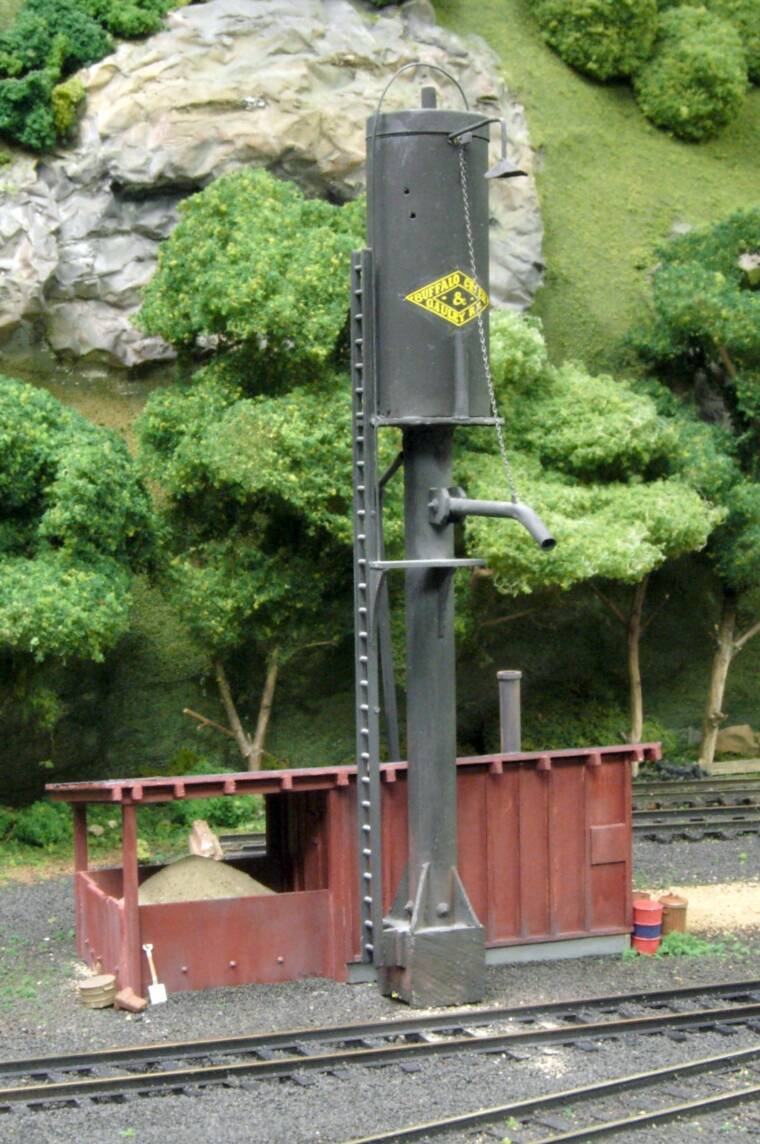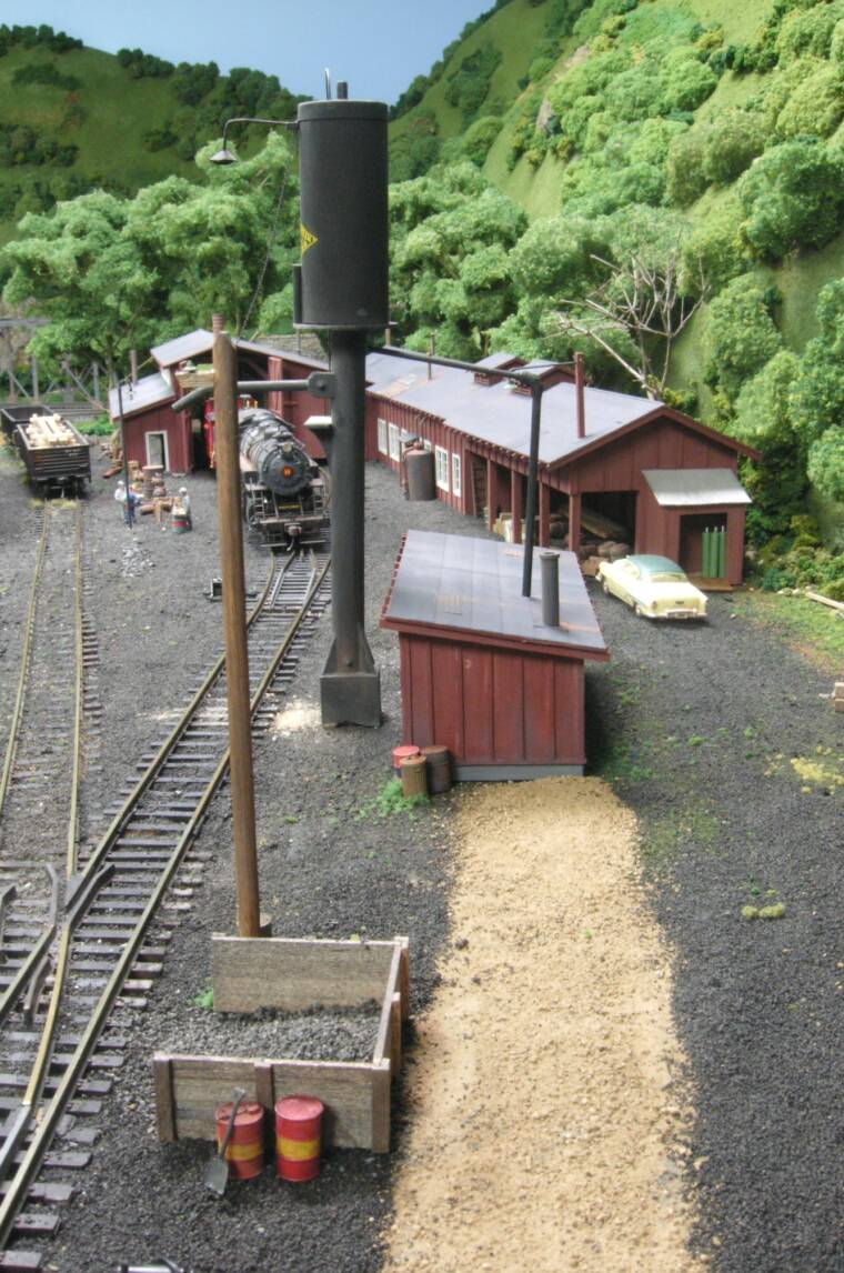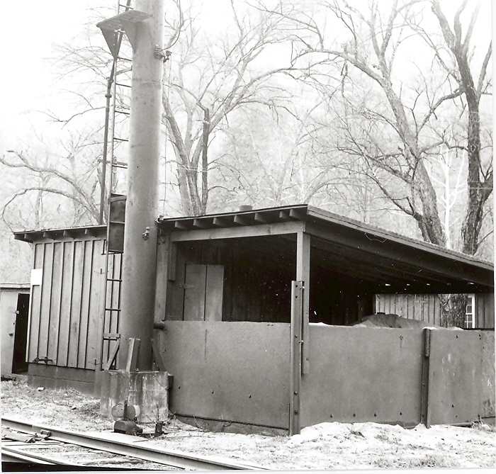 The photo on the left is my model of the sand house and tower that stood in front of the engine house. Compare it with the two prototype photos above and to the right. As with the engine house, my model is a mirror image of the prototype. Note that the model is of the "new" sandhouse that was built after 1958 and included a cover over the sand pile.