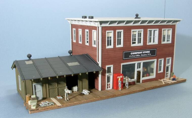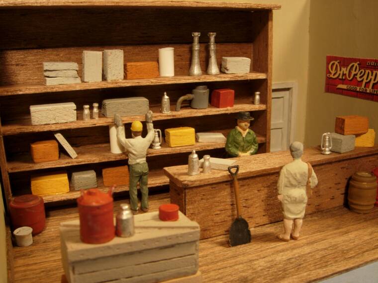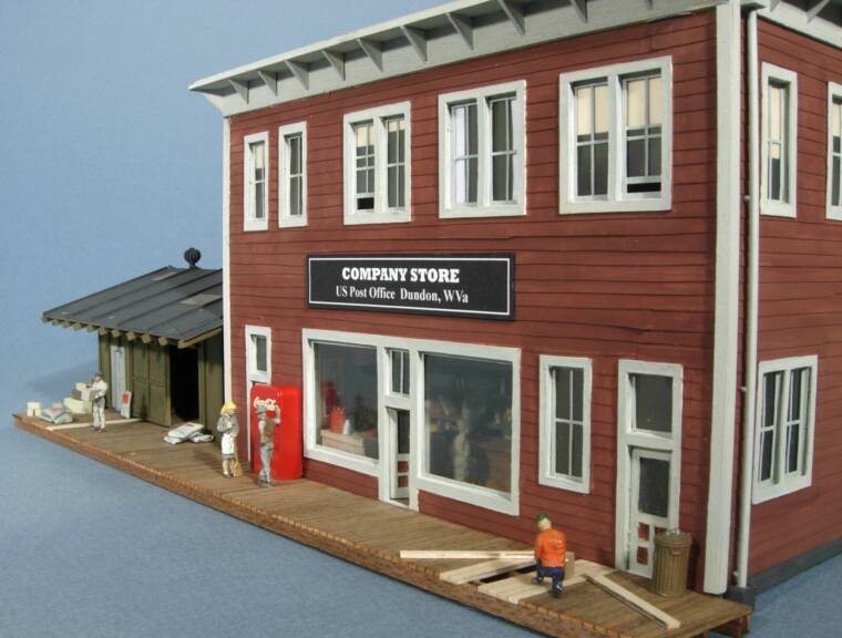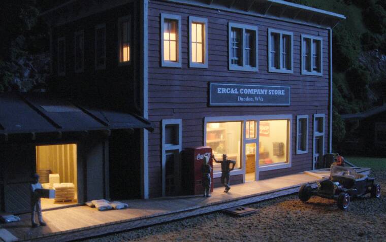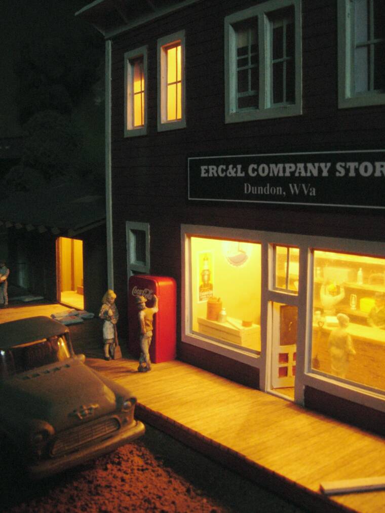 Here are some photos of my model of the Dundon Company Store and the smaller feed storage building attached to it. I have added a Coke machine to the boardwalk where a man and young lady are chatting. A workman is doing some repair on the boardwalk down at the store end, and has replaced two boards already down in front of the feedstore. Both the store and feed building have lighted interiors...seen in the photos to the left. In the store, the man behind the counter is store manager, Mr. Newman Baughman. On the other side of the counter preparing to make a purchase is Opal Triplett, a local school teacher. In the back James Stidon is pulling a box off the shelf for a delivery to someone in Dundon. (Thanks to Patsy Baughman for providing the names of these folks!)