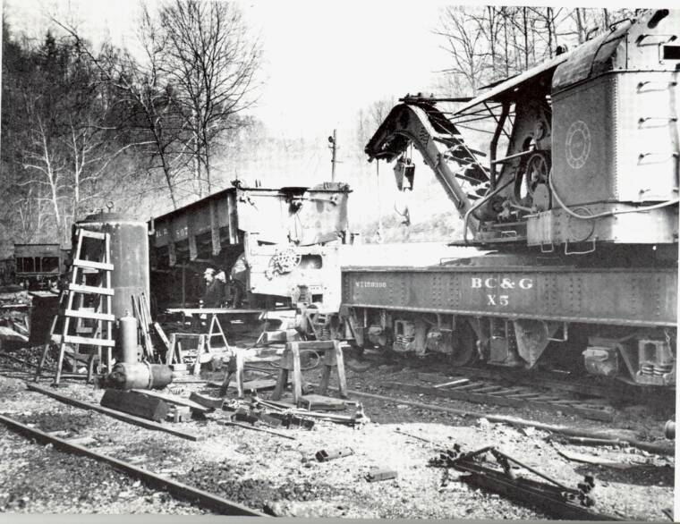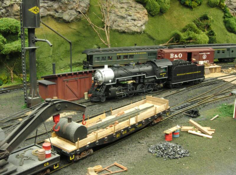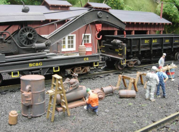 The scratchbuilt ex-Seabord Airline 150-ton crane and its tender flat #108 are in the foreground.