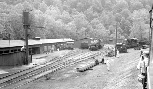 This view is taken looking the opposite direction...toward WIden. BC&G #4 is sitting near the sand tower. Dining Car X-6 and ex-Pennsy coach X16 are visible on the siding in the background. The B&O boxcar is sitting at a freelance loading dock in the yard that was added to increase operational opportunities.