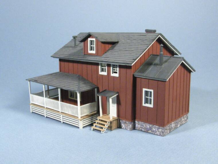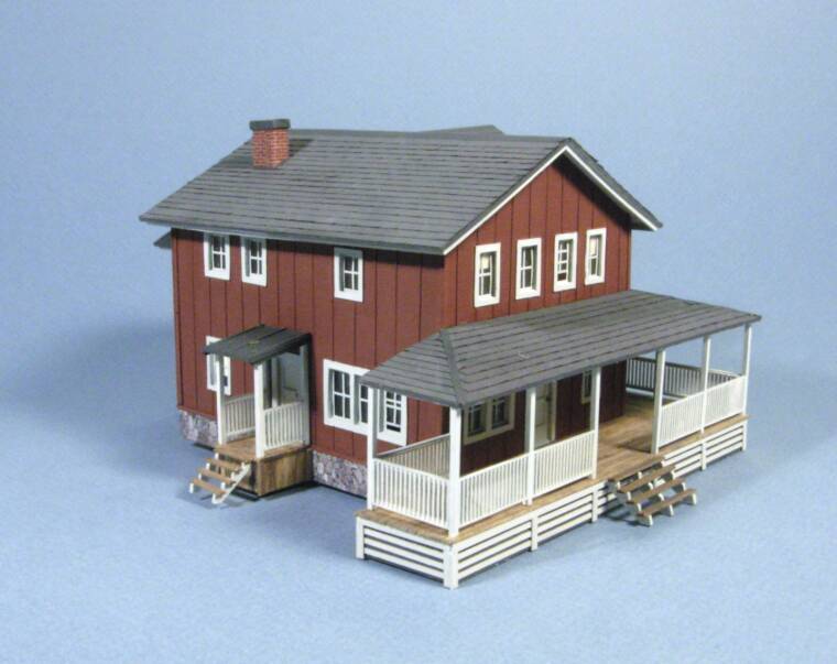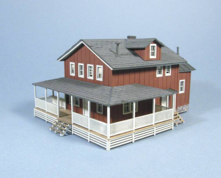 Here is my completed model of J.G. Bradley's house. It was built from the only decent photo (insert) plus recollections graciously provided by Patsy Baughman. It will occupy a spot on a hill overlooking the Dundon Shops on the layout. Perhaps Mr. Bradley himself will be standing on the front porch overlooking his 'empire'.