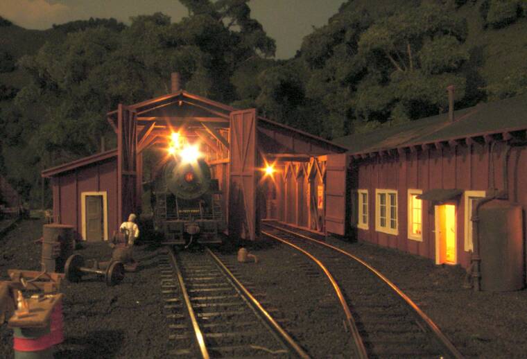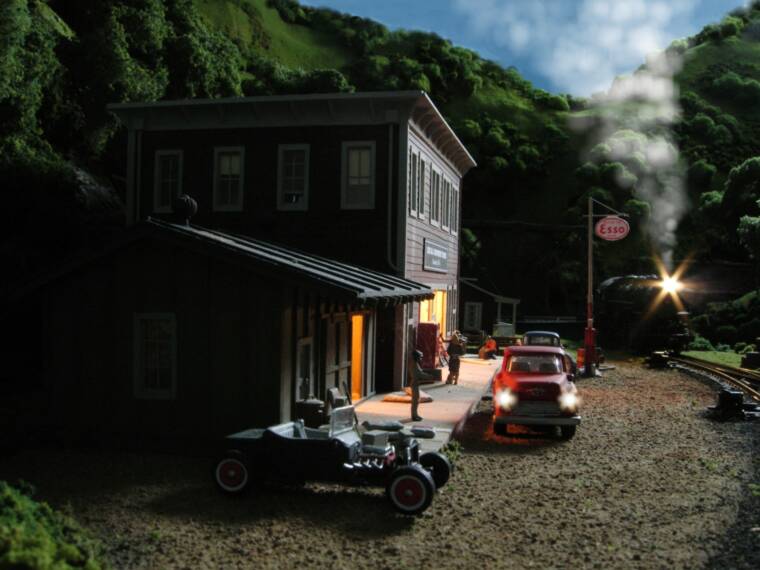 Photographer's Note: These three photos were taken using only the light from the interior of the store and a small amount of evening light entering the train room through a glass-block window. The blue cast in the upper photo is the result of improper white balancing in the digital camera. It is one of those 'fortunate mistakes'. In the photo to the right, the headlights of the pickup and the engine smoke were added digitally.