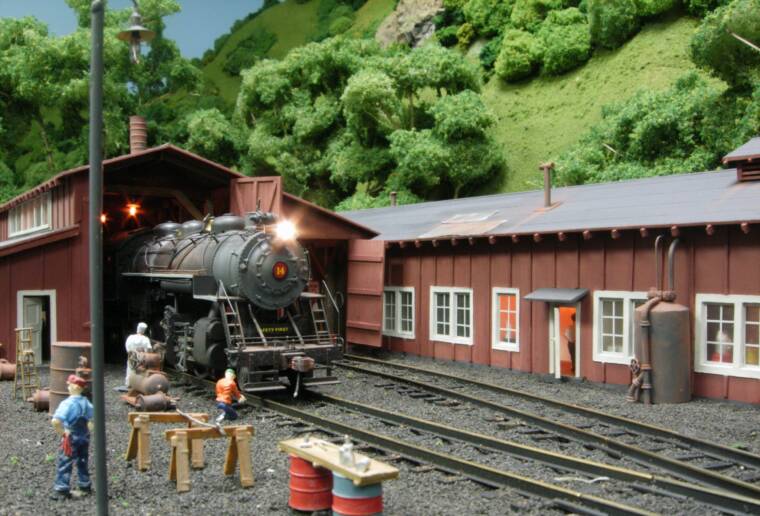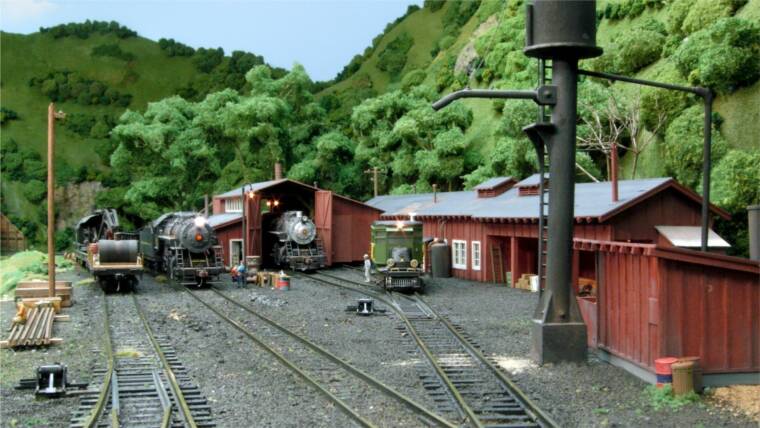 Here's another view of the Dundon shops model. Compare it with the prototype photo above. The prototype photo was taken somethime before 1958 and therefore includes the "old" sandhouse while the model has the newer sandhouse. Other prototype details captured in the model include the ash pit, the light colored car with a dark roof, the acetylene tanks in the shed at the end of the machine shop and the power pole.