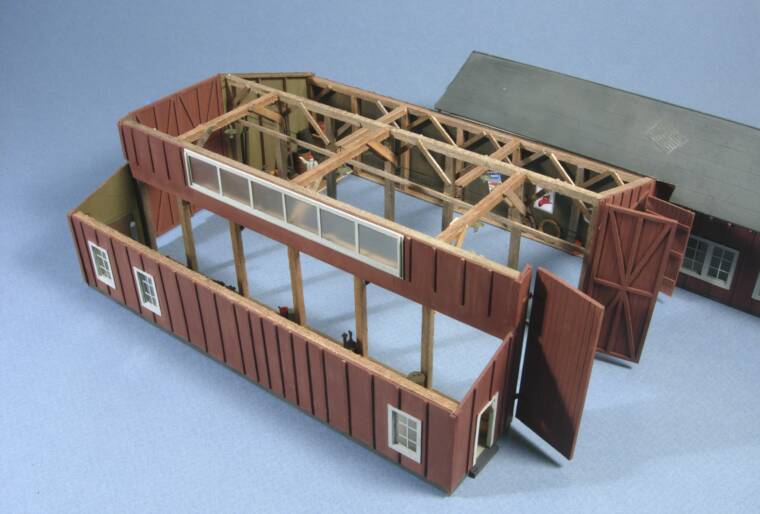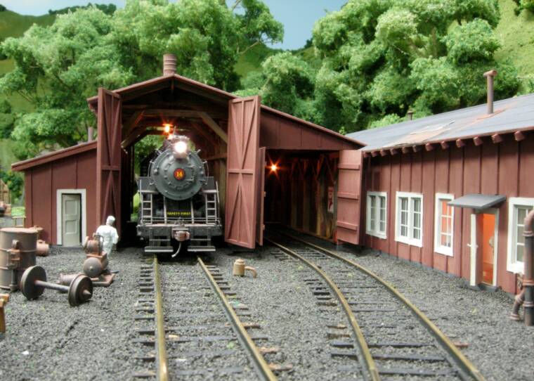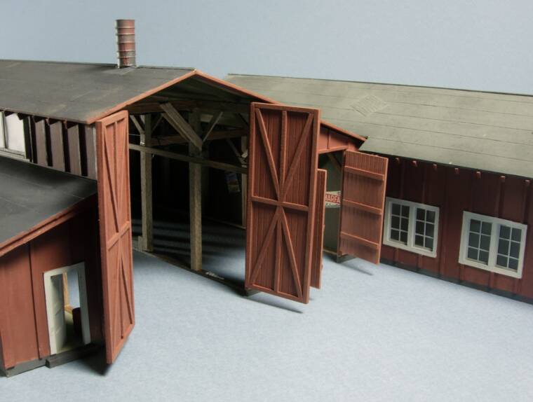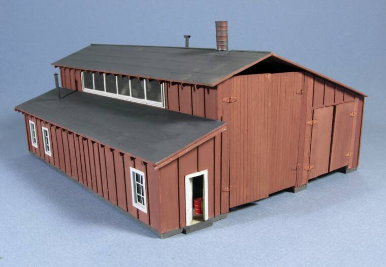 Here is my "new" and more accurate model of the Dundon engine house. It features a complete interior with structure, workbench spare parts and lighting and the doors are hinged. The interior structure was modeled from sketches prepared by Phil Bonzon. The unique smoke vent made from 55-gallon drums appear in very late photos of the engine house. (see above)