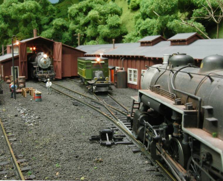The layout utilizes American Models flexible track and turnouts. All locomotives and rolling stock are equipped with hi-rail wheels and Kadee #802 couplers are used exclusively. All the structures on the layout are scratchbuilt.