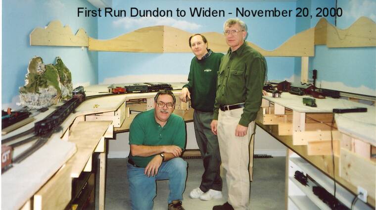 The last section of track had been laid the month before. On this visit by Paul Sullivan of Colorado (left) and Frank Criswell of Indiana (right) the first train made a complete run from Dundon to Widen. It was an event well worth celebrating with two great modeling buddies!