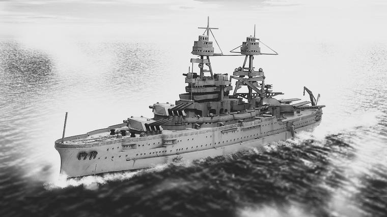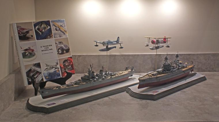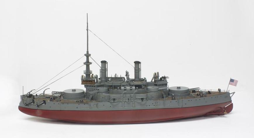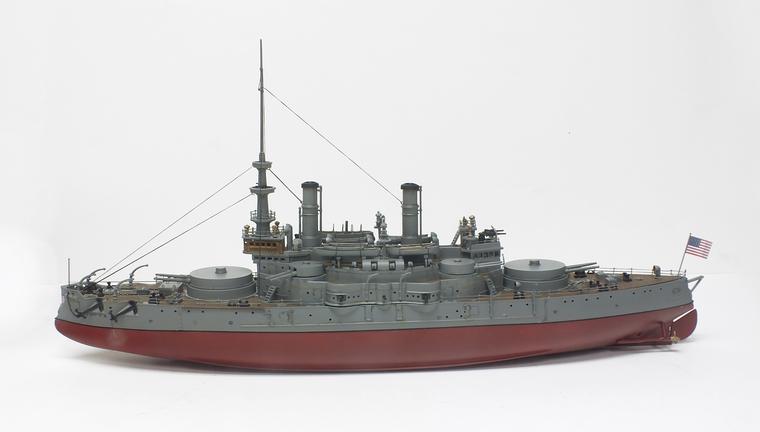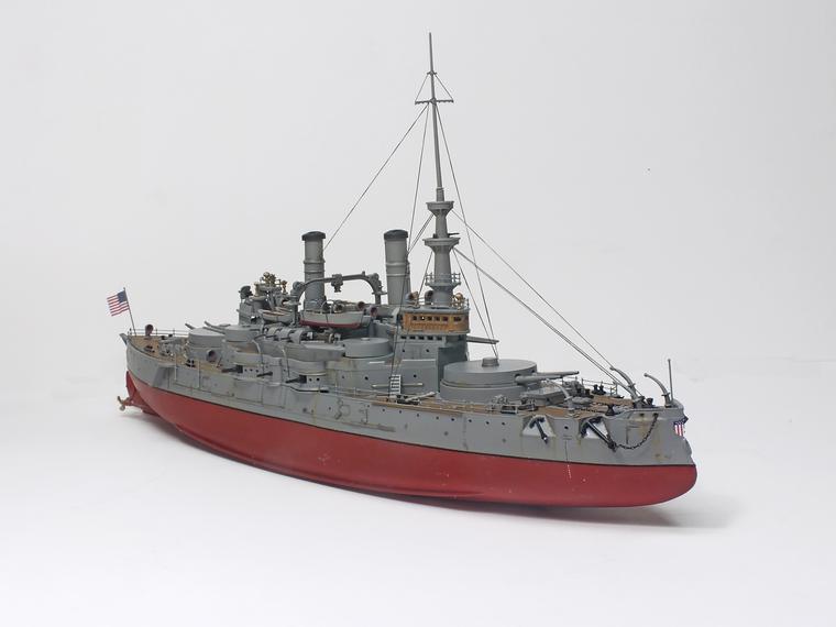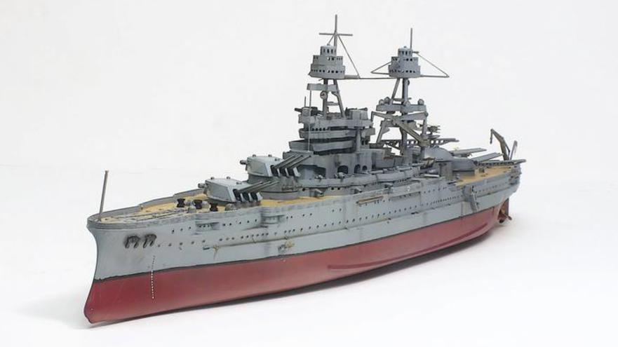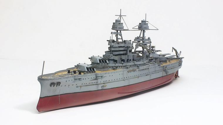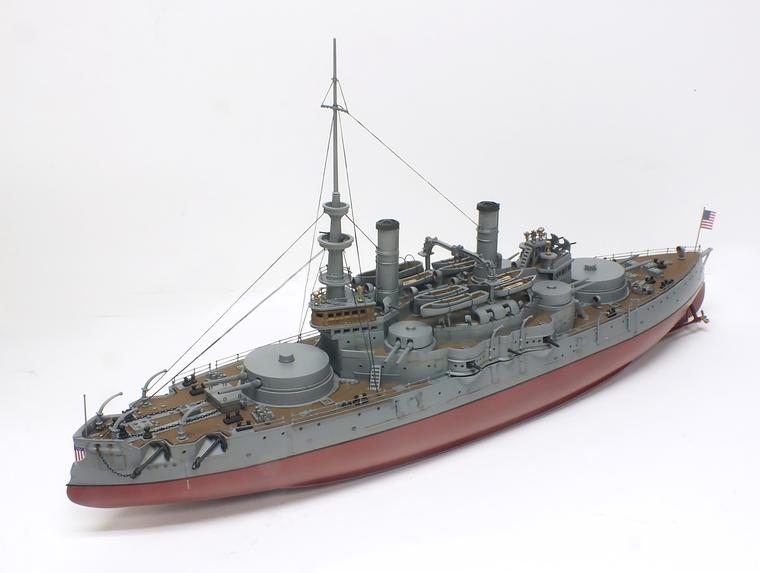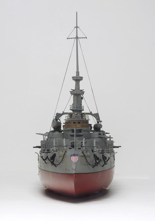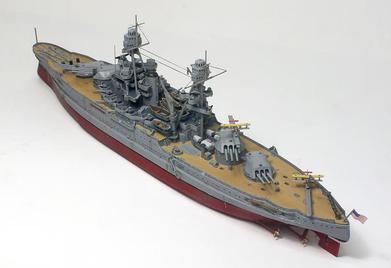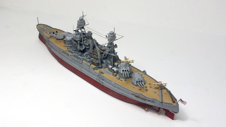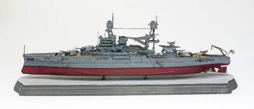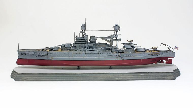 USS ARIZONA - The 1:426 scale model was built from a Revell kit issued in 2021 but the tooling is from 1959! The model was built with only parts included in the kit. The model is painted in the pre-WWII scheme and is moderately weathered. Many times the Arizona is modeled in the scheme she wore while at Pearl Harbor which was a much darker grey with light grey observation towers.