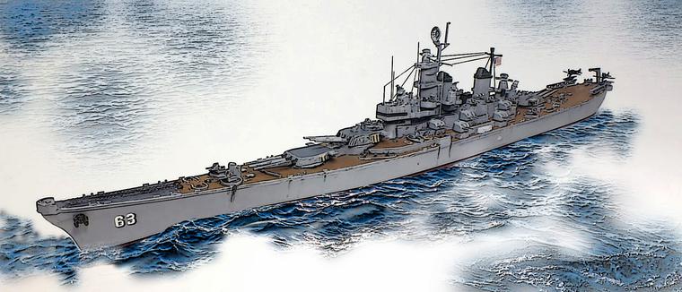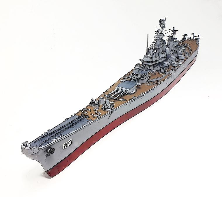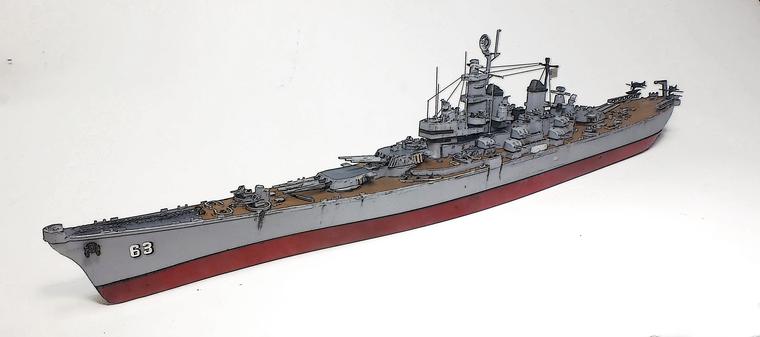 USS MISSOURI - The 1:535 scale model was built from a Revell kit issued in 2004 but the date embossed in the hull is 1953. That means the tooling from which the model was made is just over 70 years old. The model was built with only parts included in the kit except for the few whip antennae. EZ line was used for the simplified rigging. The three images here have been enhanced using a filter in Photoshop.