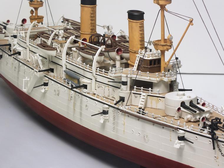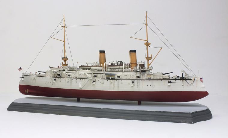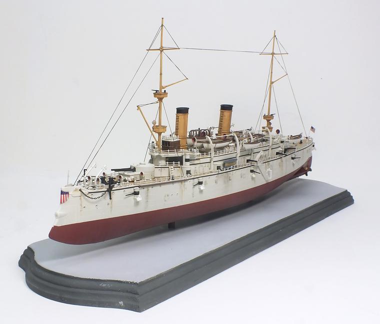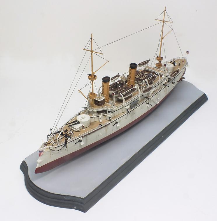 USS OLYMPIA - Built in 1895, the Olympia was the only "Protected Cruiser" class ship ever built. The 1:232 model was built from a 2002 issue of a Revell kit with tooling dating from 1959. The hull was painted Tamiya Insignia White. Metal link chain was added for the anchors while all the railings and rigging were done with EZ Line elastic thread. The base is from Hobby Lobby painted appropriately.