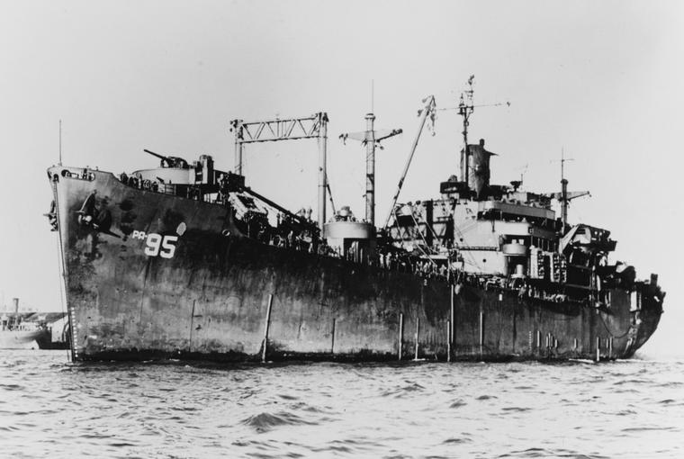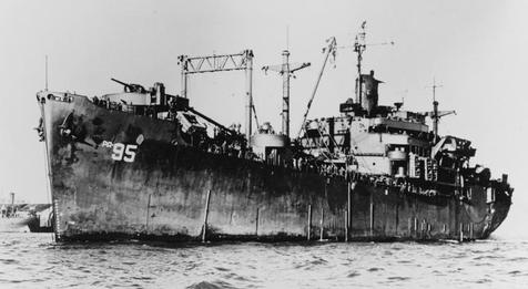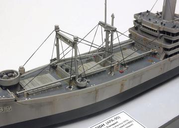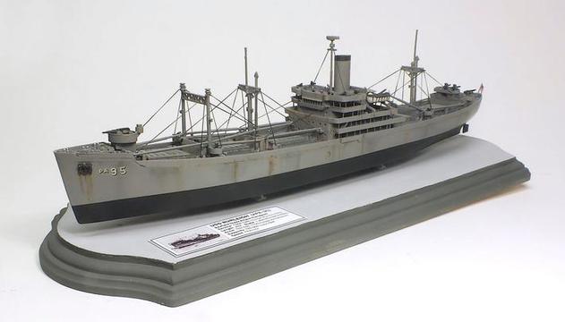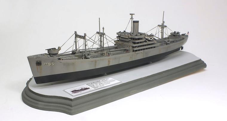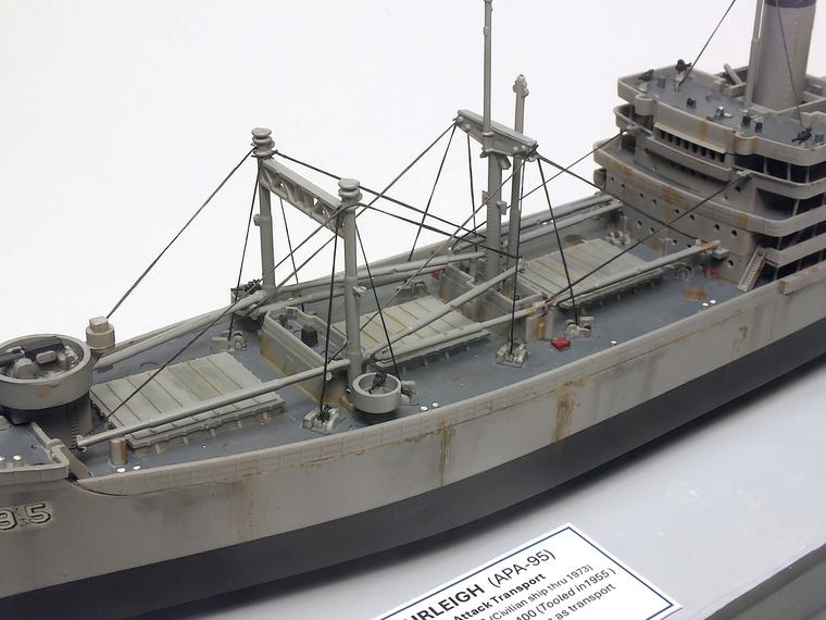 USS BURLEIGH (APA 95) - This 16" long model (1:400 scale) was built from a Revell kit. The ship, a 492-foot Bayfield-class attack transport, was built in 1944 and only served in the Navy until 1946. After that, it was converted to a civilian freighter and renamed Hawaiian Pilot. Revell built a kit of that version of the ship as well. The kit was issued in 1995 but the tooling date on the inside of the hull is 1955!