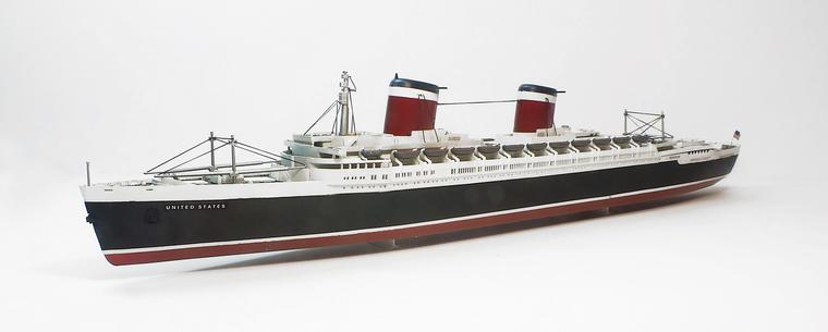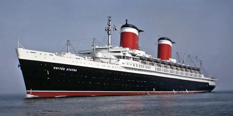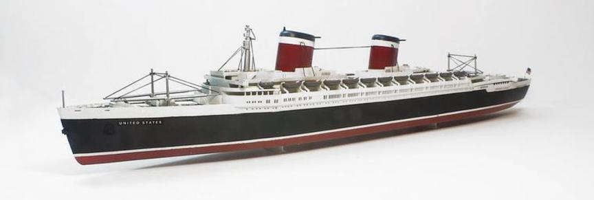 SS UNITED STATES - This ship, one of the very few ocean liners ever built in the US, made it's maiden trans-Atlantic voyage in 1952. On the return, it set a record that stands today. She crossed in 3 days and 10 hours and averaged nearly 35 mph! The top speed in speed trials was 44 mph. The hull and propulsion system designs remained classified for years. Retired in 1969, the SS United States made exactly 400 trans-Atlantic crossings. The ship used extensive amounts of aluminum, including the life boats, hence the grey color. To minimize vibrations, two of the props had 4 blades and two had 5 blades. The ship is 990 feet long, carried 2000 passengers and the crew numbered 950. The ship was said to be 'fire proof', the only wood being the chopping blocks in the kitchen and the pianos, which used specially treated wood. With no wood accents and lots of aluminum, the interior decor was quite spartan in appearance. By any metric this was a very handsome ship with exceptional performance.