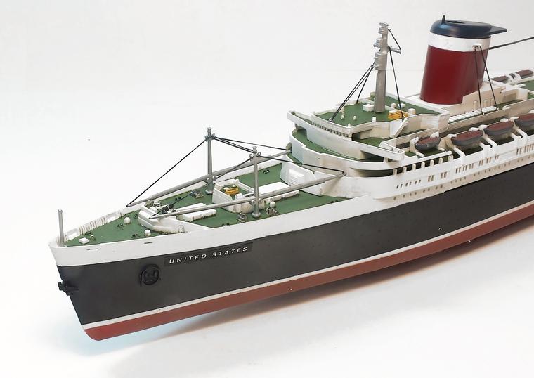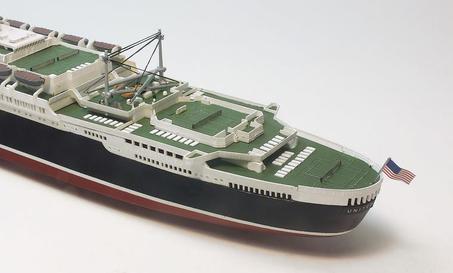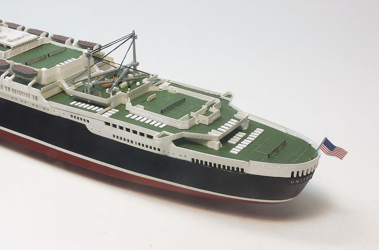 This model was built from a 1/601 scale Revell kit that was tooled in 1955. The instructions were dated 1973. Because the design of the hull was confidential when the model was tooled, there us no bottom detail nor are the props modeled. It was a very fussy kit and considerable tuning of some parts was required. I added a representation of deck chairs (prototype photo, left) and added nets on the tennis courts. The rigging was made using E-Z Line using photos as guides.