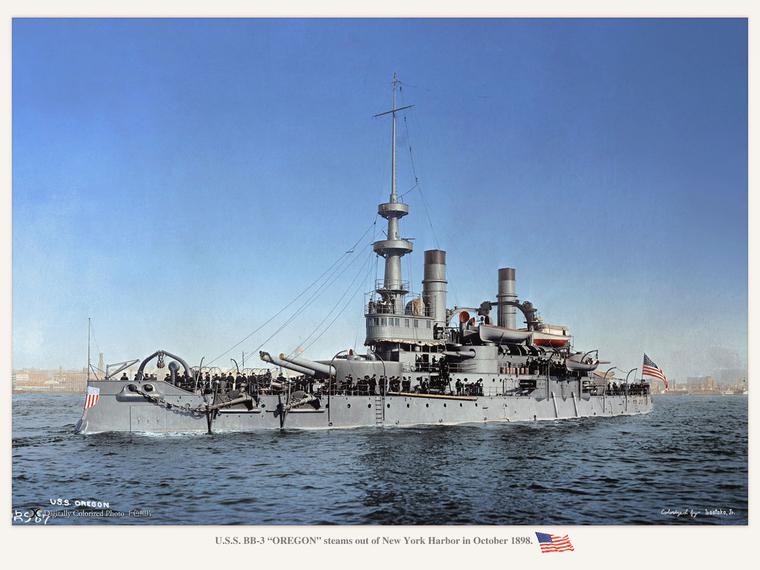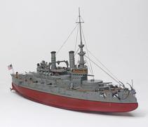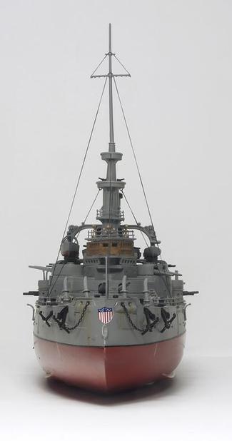 USS OREGON (BB-3) - This battleship was built in 1896 and served until 1919. The 1:225 scale model was built from a Glencoe Models kit. The date on the instructions is 1989 but I'm not sure when it was tooled. The model was detailed by adding railings made from .020" brass rod stanchions and E-Z line for the horizontal elements. Link chain was added for the anchors and oars were cut from styrene for the lifeboats. The captain's launch was detailed with supports for the canvas enclosure and details for the powerplant. The model is in the paint scheme used during the Spanish-American War.