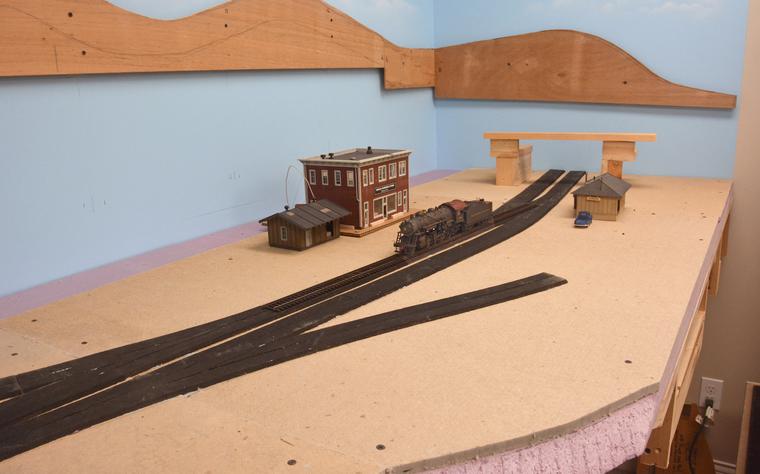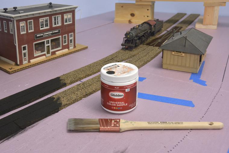 Cork roadbed from Scenery Unlimited was bonded to the foam with Loctite FoamBoard adhesive along centerlines drawn on the foam. The cork was then painted black with inexpensive flat black latex paint. The dotted line below the brush handle in the photo is the centerline for the siding behind the station that will be laid directly on the foam without roadbed.