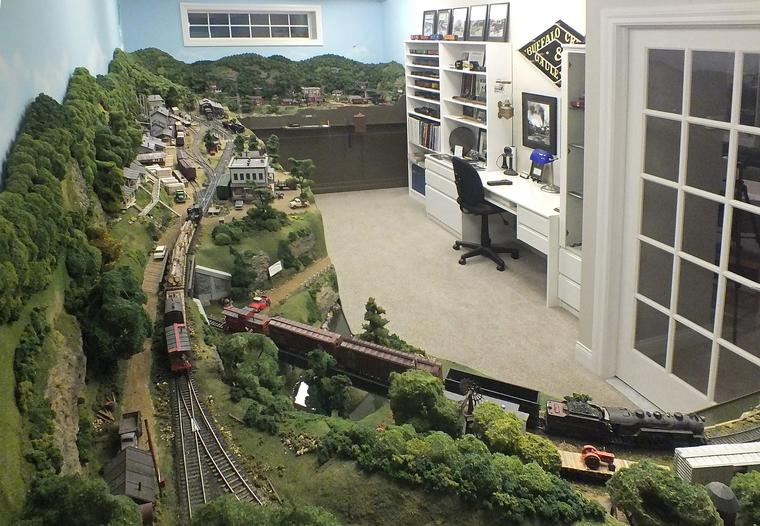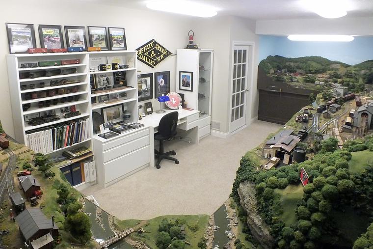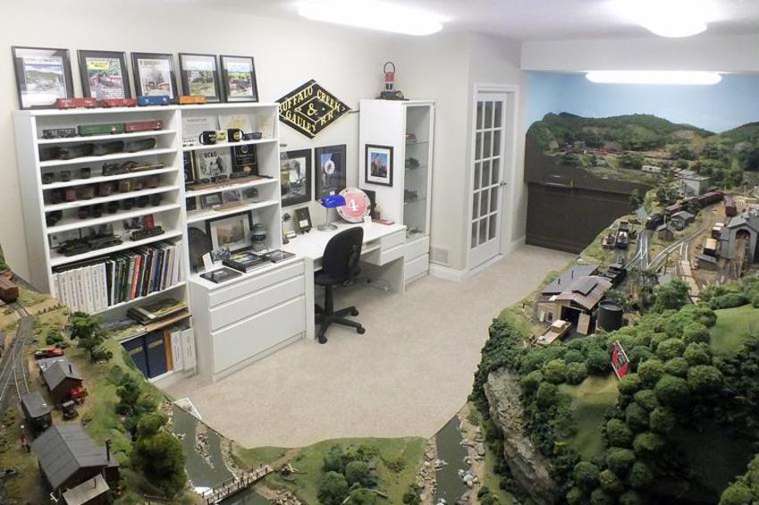The layout occupies three walls of the layout room and along the fourth wall is a desk and display shelves. The room is carpeted and illuminated by ceiling mounted fluorescent fixtures..