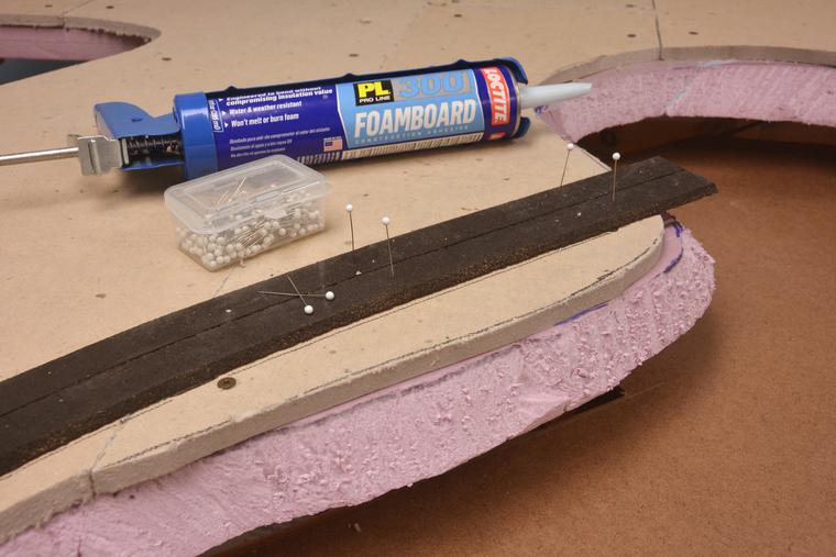 Left - The Homasote was bonded to the foam with Loctite Foamboard adhesive caulk. Drywall screws were used to hold the two together until the adhesive set. Cork roadbed was attached to the Homasote with the same caulk and held in place with pins until set.