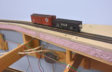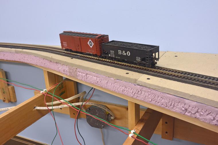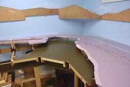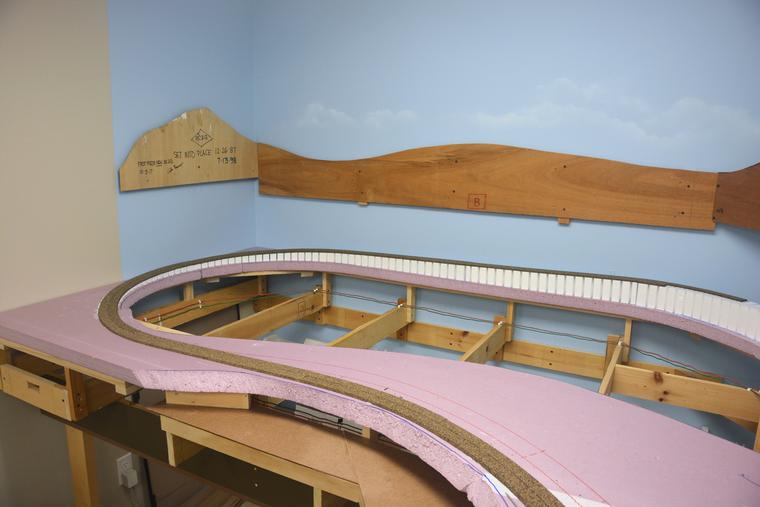 At this point I temporarily laid some track and ran trains over 12' of track and discovered that there was a great deal of noise transmitted by the surface of the foam. After experimenting with foam and Homasote road bed, I concluded that the best way to quiet the noise was to cover the surface of the foam with 1/2" Homasote. I removed the cork roadbed already laid, installed the Homasote and reinstalled the cork.