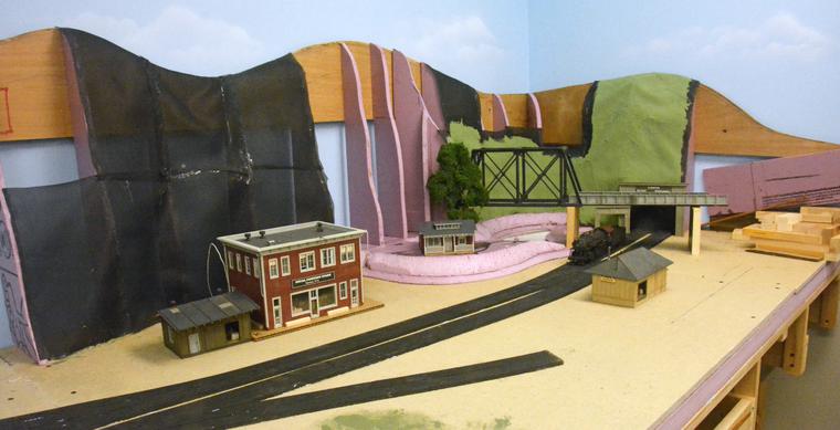 Woodland Scenics foam riser system was used to create the 3% grade behind the log camp. It works just great for S track. It was glued to the 1 1/2" foam and the cork roadbed was bonded on top.
