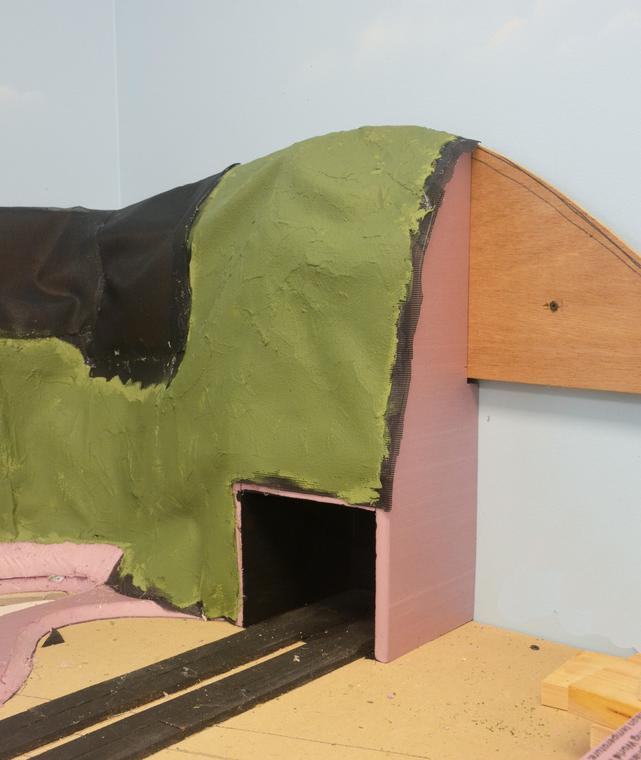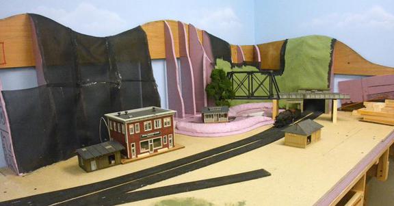 After some experimentation, I developed a plaster-free technique for building landforms. Profiles are made from 1/2" pink foam. Black plastic screening (the type used for sun-blocking screens which has very small holes) is attached to the profiles with hot-melt glue. Bob Stelmach, a fellow S gauger, uses a thick texture paint called Homax (available at Home Depot) over metal screen. I used the same product, tinted green by Home Depot over the plastic screen material. When dried it produces a sturdy hardshell.