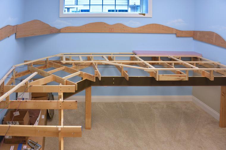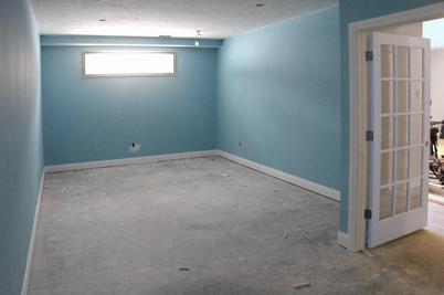 The new layout room measures 12' x 25'. I had the builder paint the walls sky blue and, after this photo was taken, install five 4-tube florescent light fixtures, carpet the floor, install ceiling speakers and put one of the wall outlets on a wall switch so that power to the layout can be turned off. As seen in the photo, there is a glass door to the layout room so it can be seen from the adjacent family room that doubles as a crew lounge.